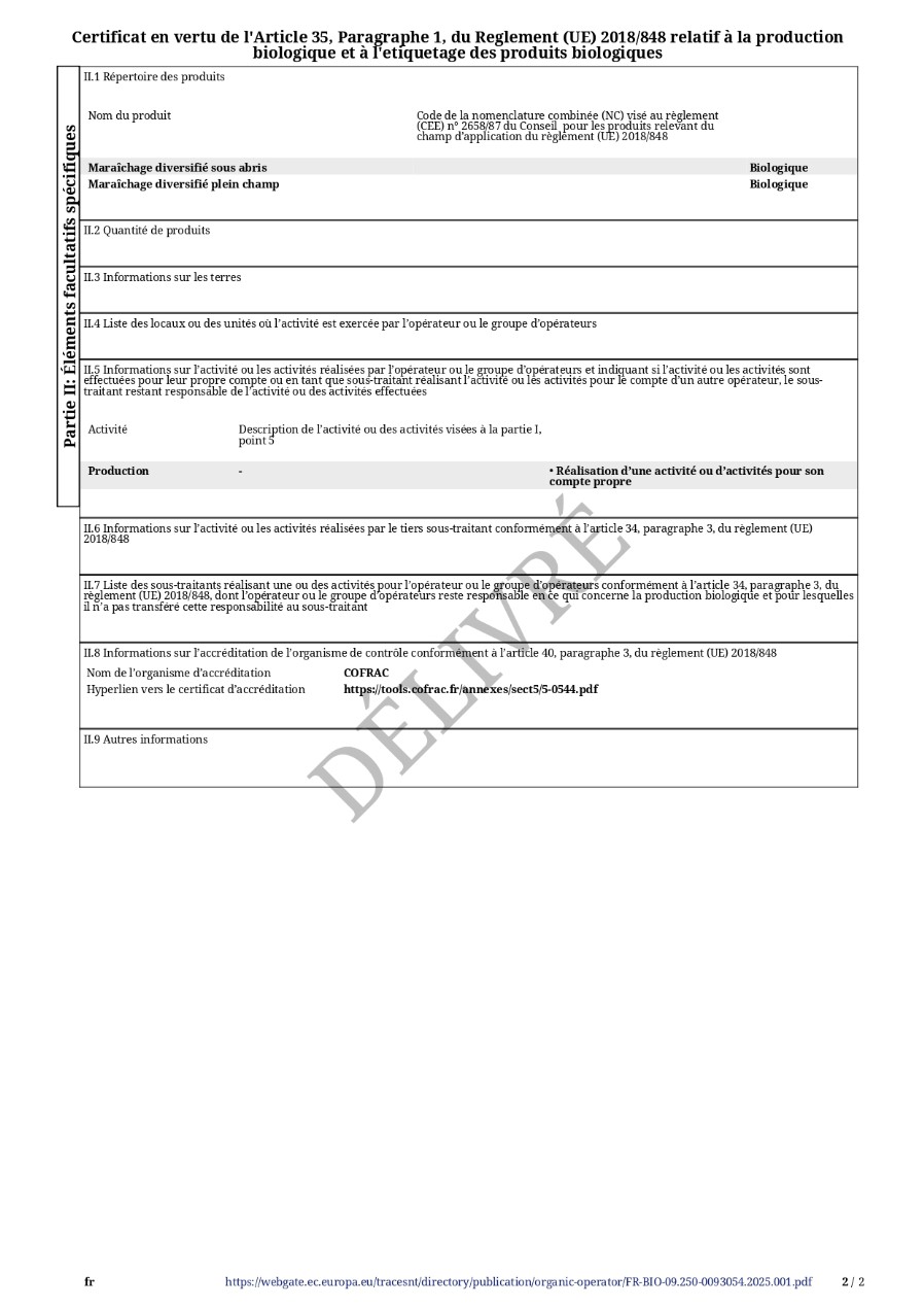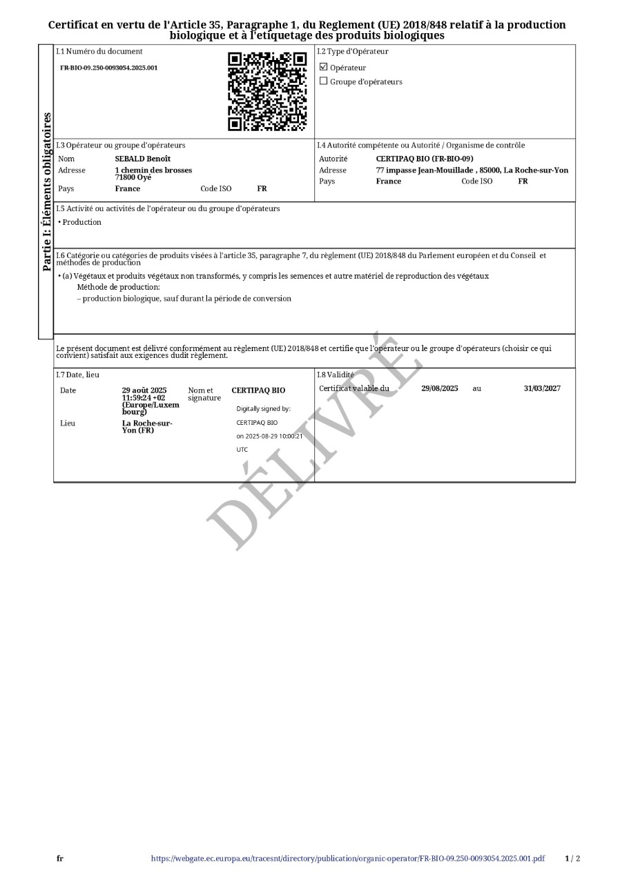 Tous les produits de la ferme sont certifiés BIO par Certipaq (FR-BIO-09), sauf les bocaux de légumes transformés (coulis de tomates, caviar d'aubergine, veloutés).